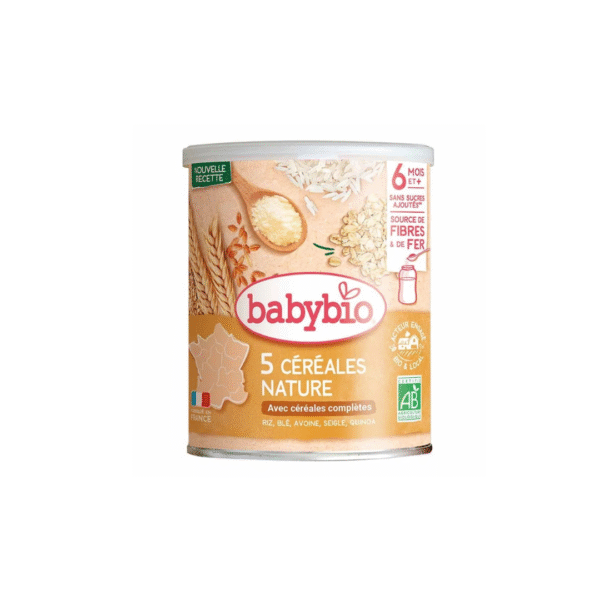 Céréales bio pour bébé à la banane et à la pomme, dès 6 mois, pour un petit-déjeuner complet et savoureux.