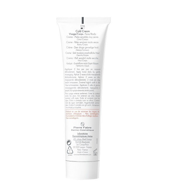 Testé en conditions de grand froid, ce soin nutritif à la texture enveloppante et au parfum léger laisse sur la peau un fini doux, non gras et non collant. Grâce au Cold Cream d’Eau Thermale Avène, un mélange traditionnel d’ingrédients issue de la pharmacopée française, la peau est nourrit, protégée et apaisée même en conditions de grand froid. Convient à toute la famille. Visage et corps.